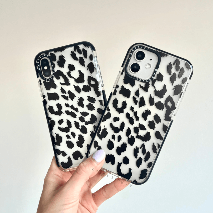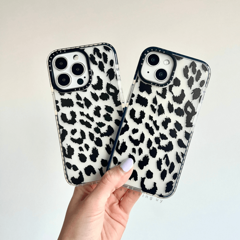 Case transparente estilo Casetify de silicona semi flexible con estampado animal print negro. Bordes reforzados