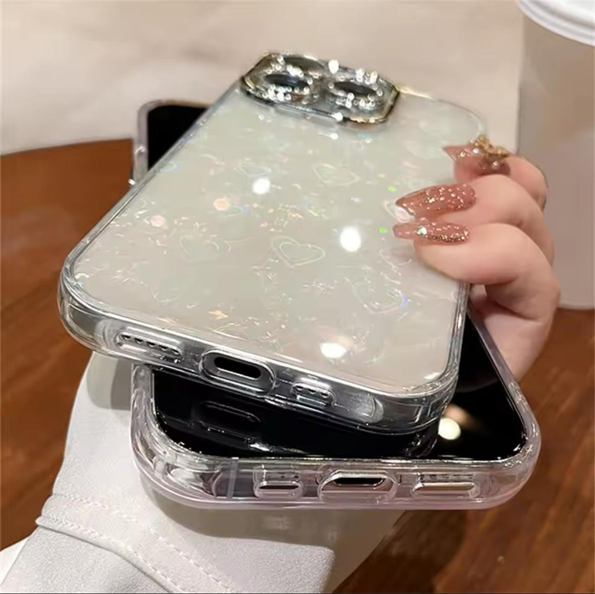 Case rígida con corazones holográficos, bordes de silicona. Cuenta con protección y glitter en las cámaras