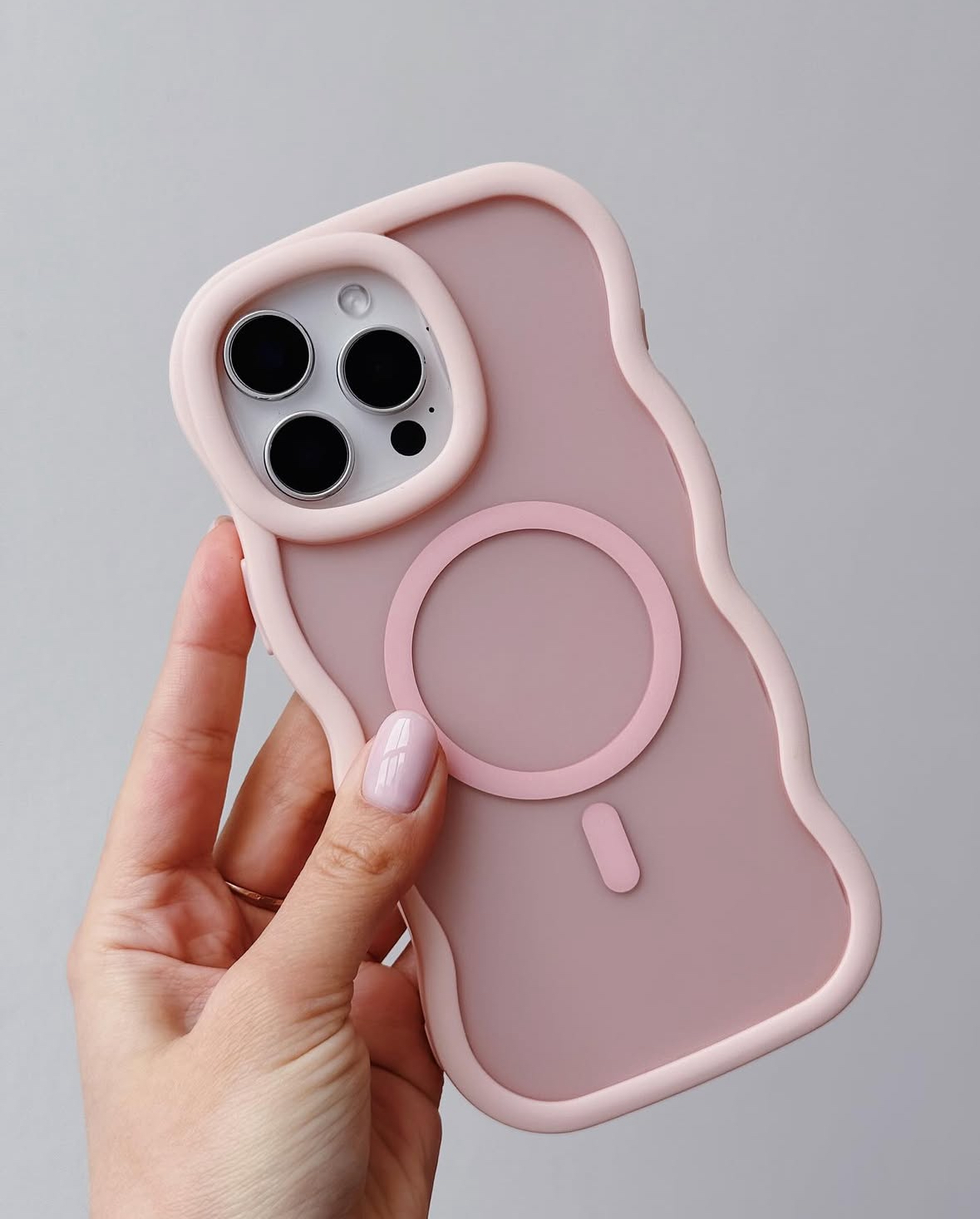 Case rígida con bordes curvos de silicona. Su parte trasera es en rosa mate.