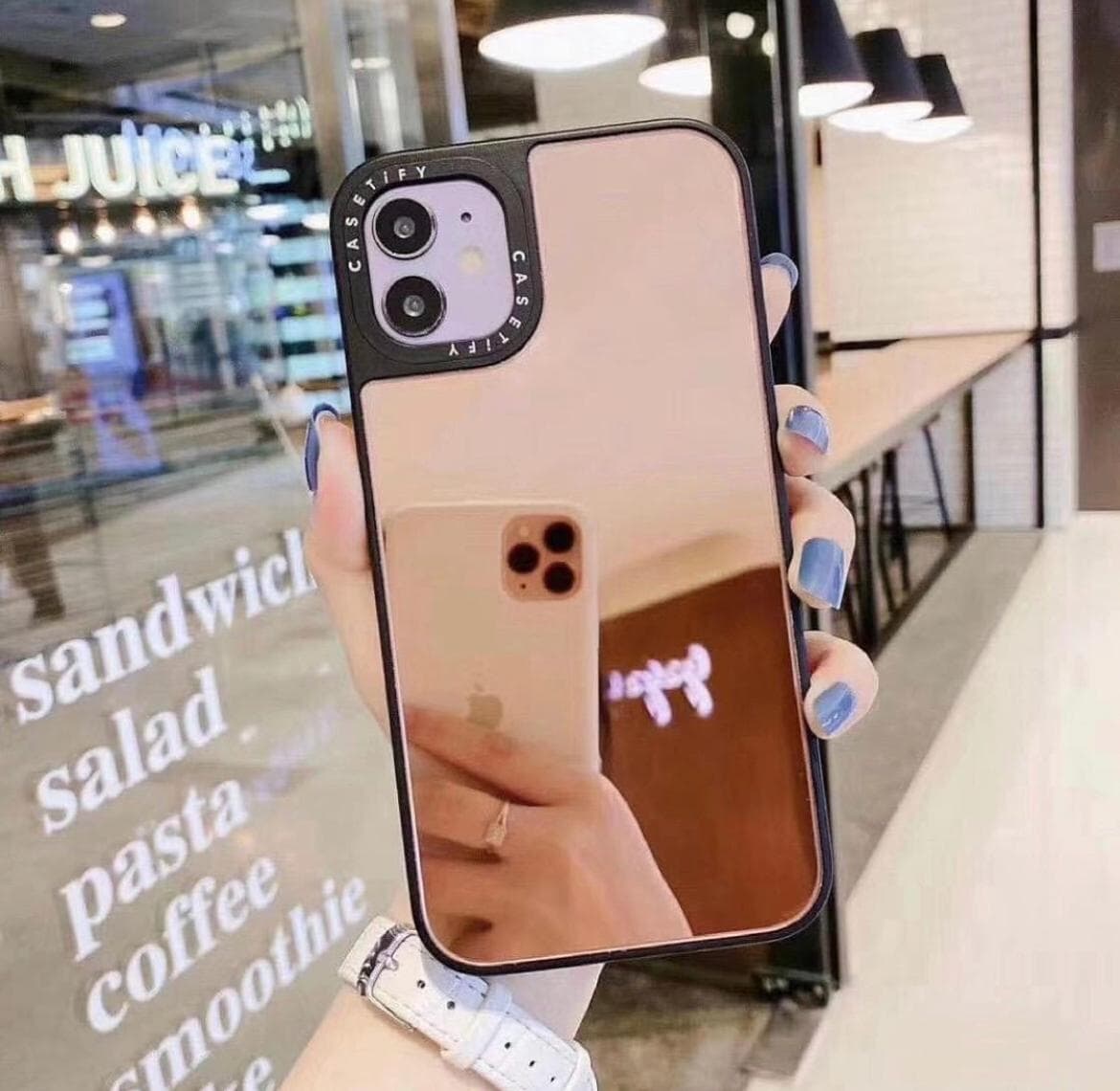 Case espejada rosa. Material trasero rígido con bordes de silicona.