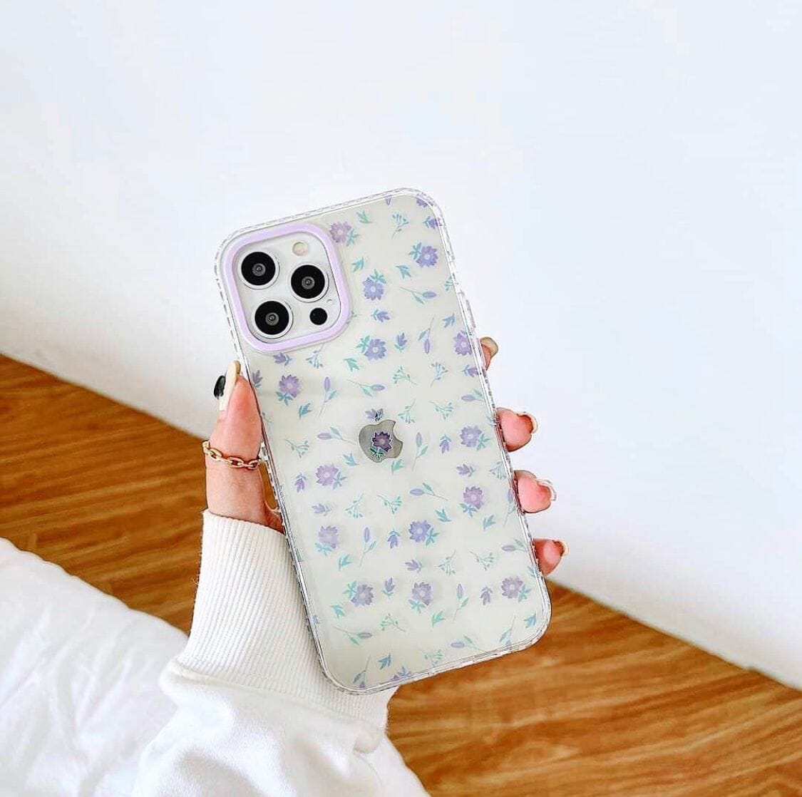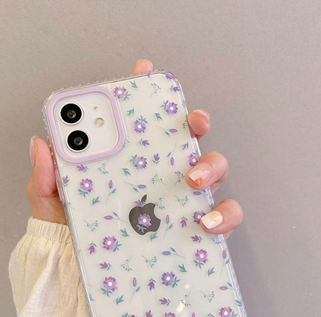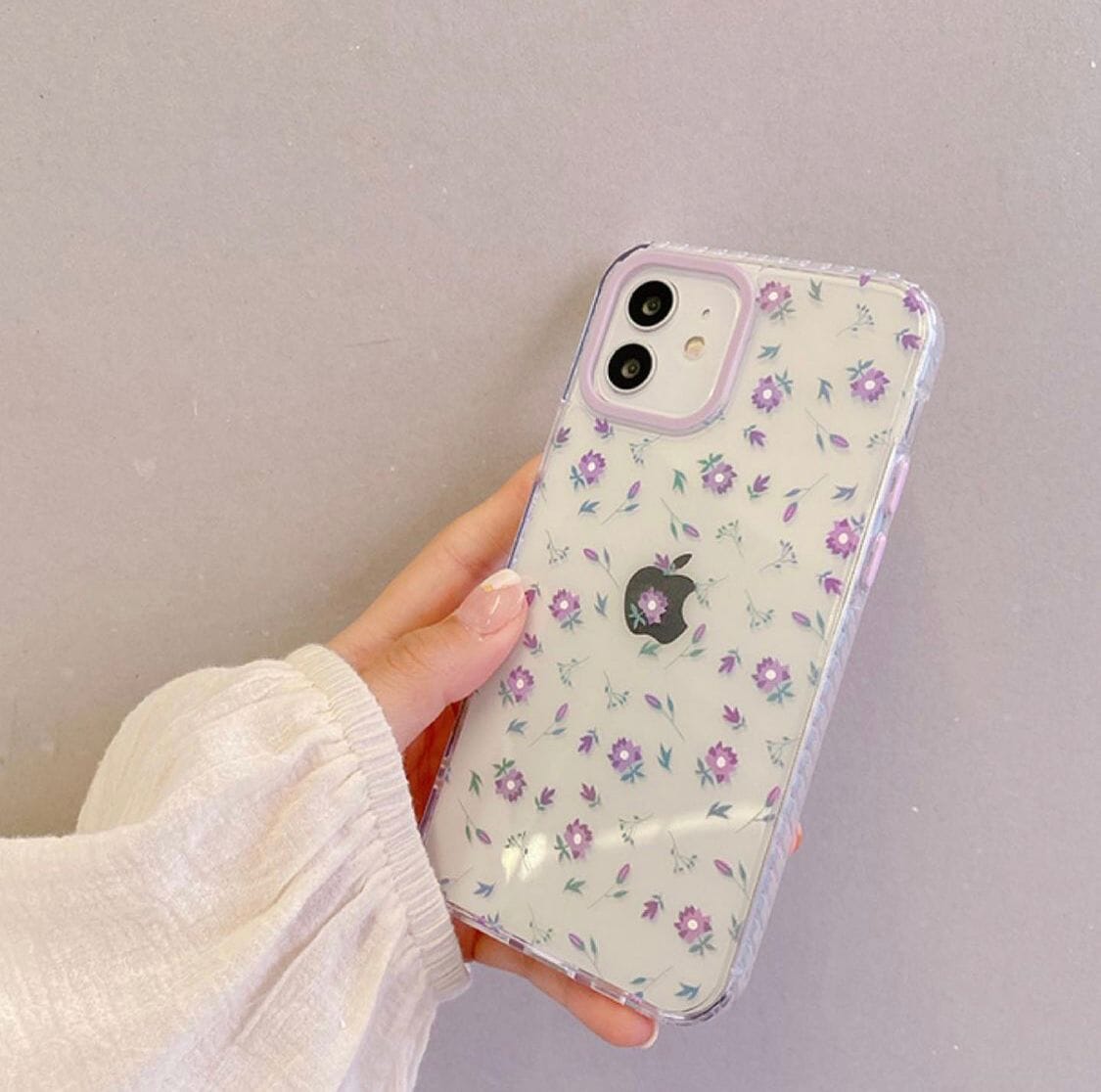 Case de silicona flexible, transparente con diseños de florecitas lila