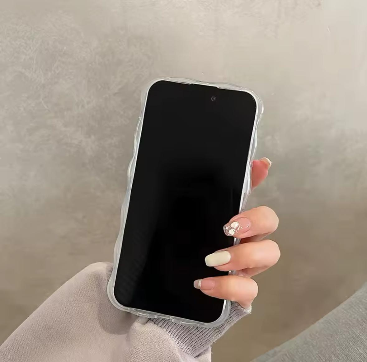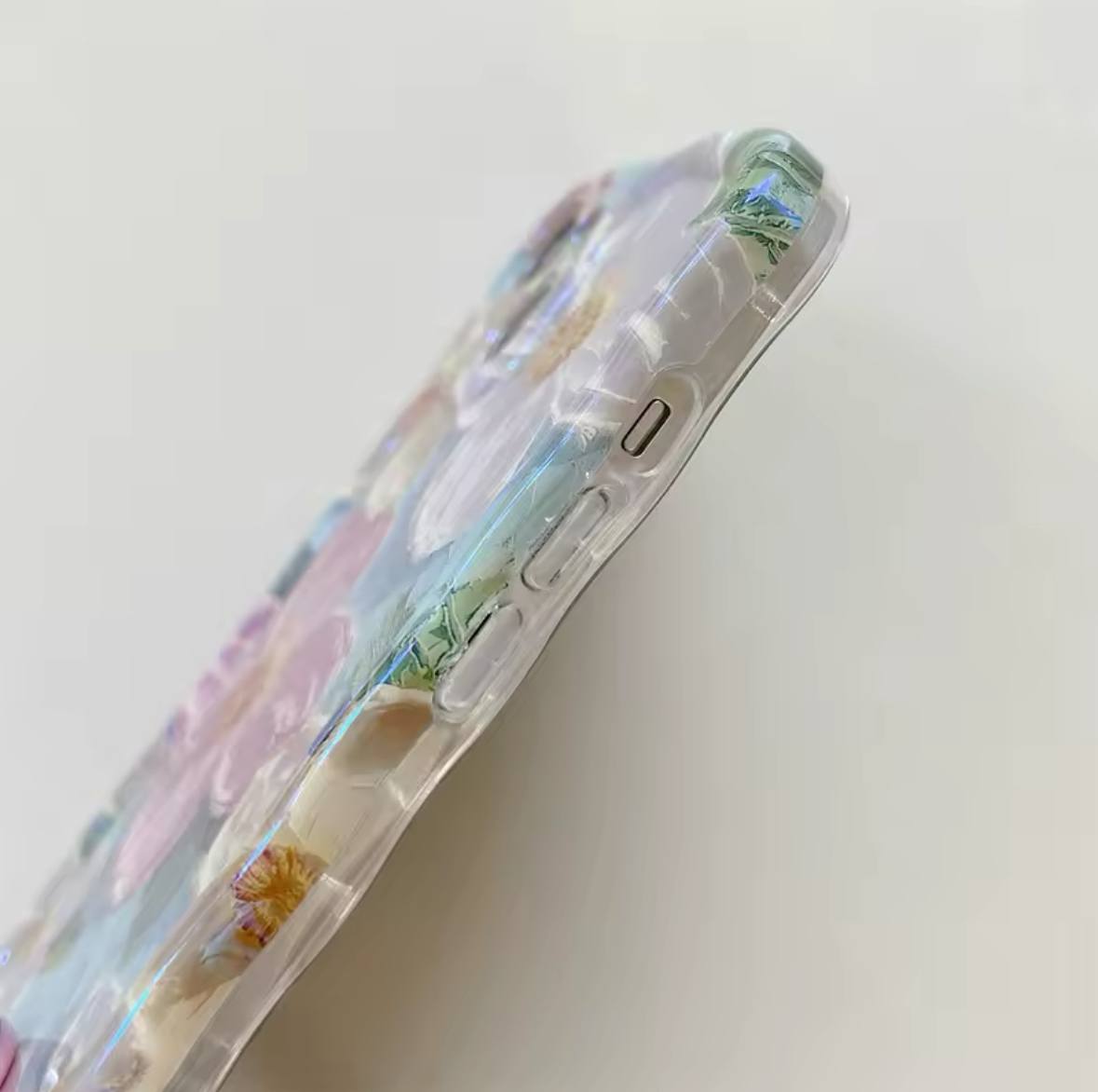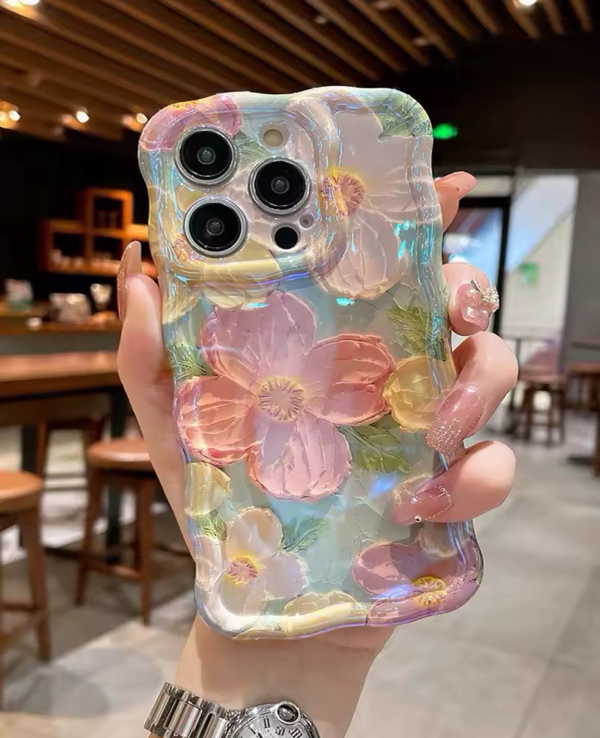 Case de silicona semi flexible con diseño de flores tipo pintadas (sin relieve) con bordes ondeados. Cuenta con protección entre las cámaras