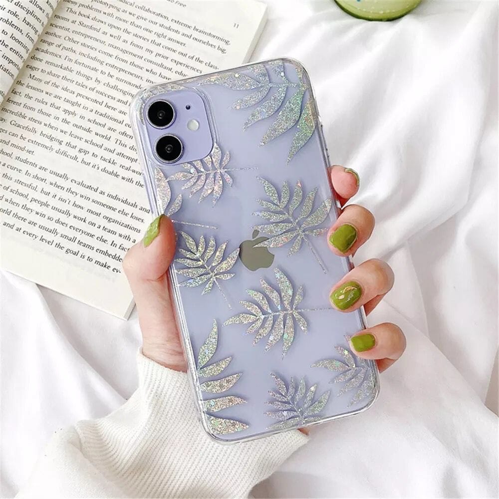 Case de silicona semi flexible, con detalles de hojas plateadas