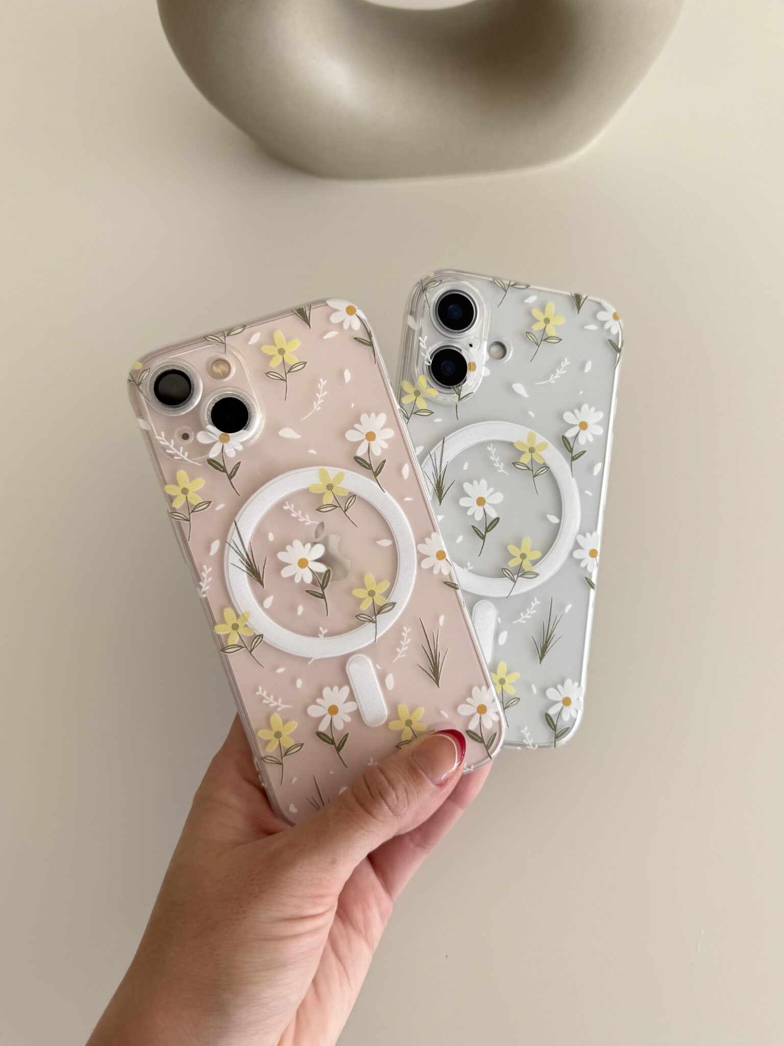 Case MagSafe con estampado de flores. Con protección entre las cámaras