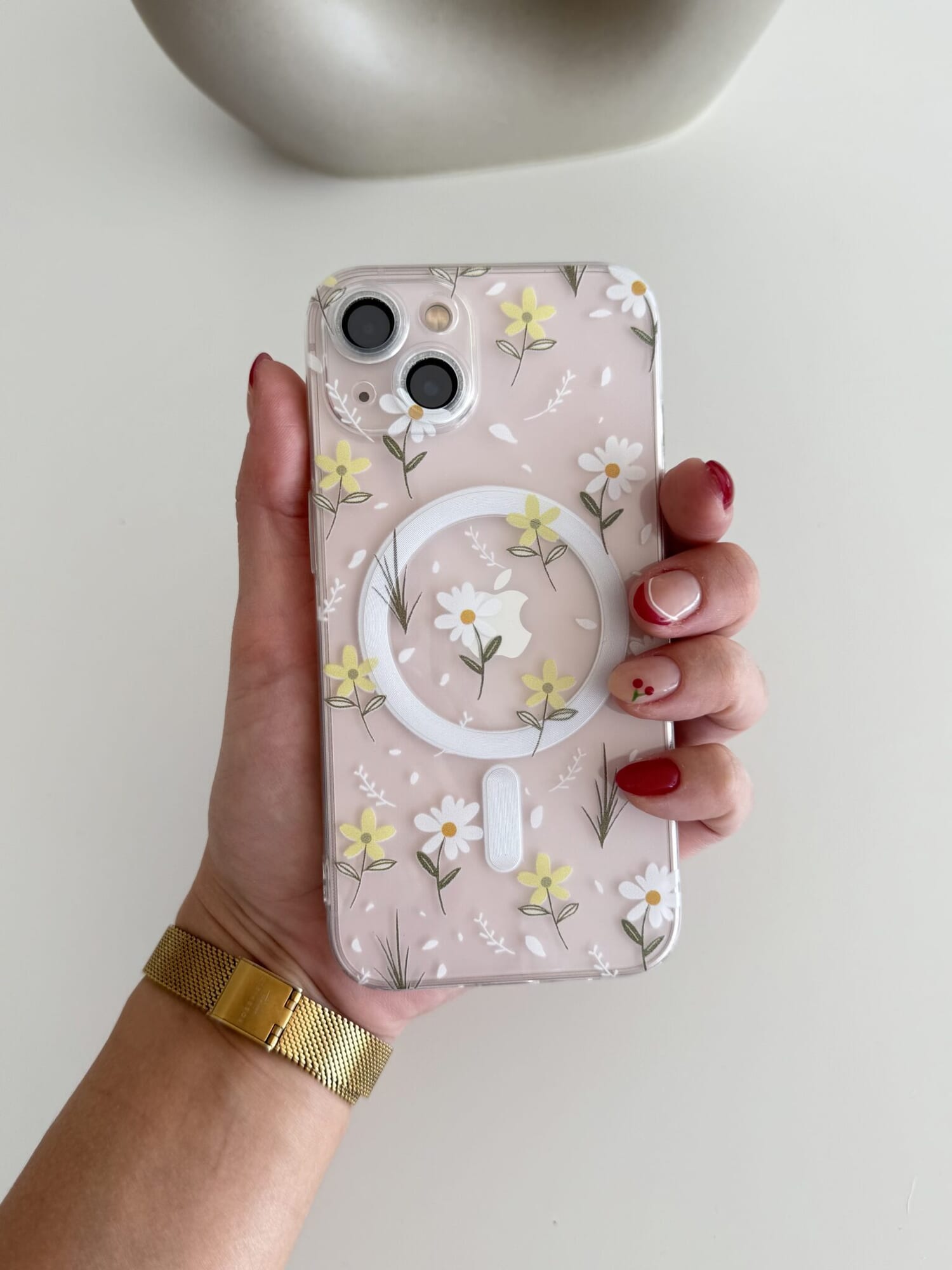 Case MagSafe con estampado de flores. Con protección entre las cámaras