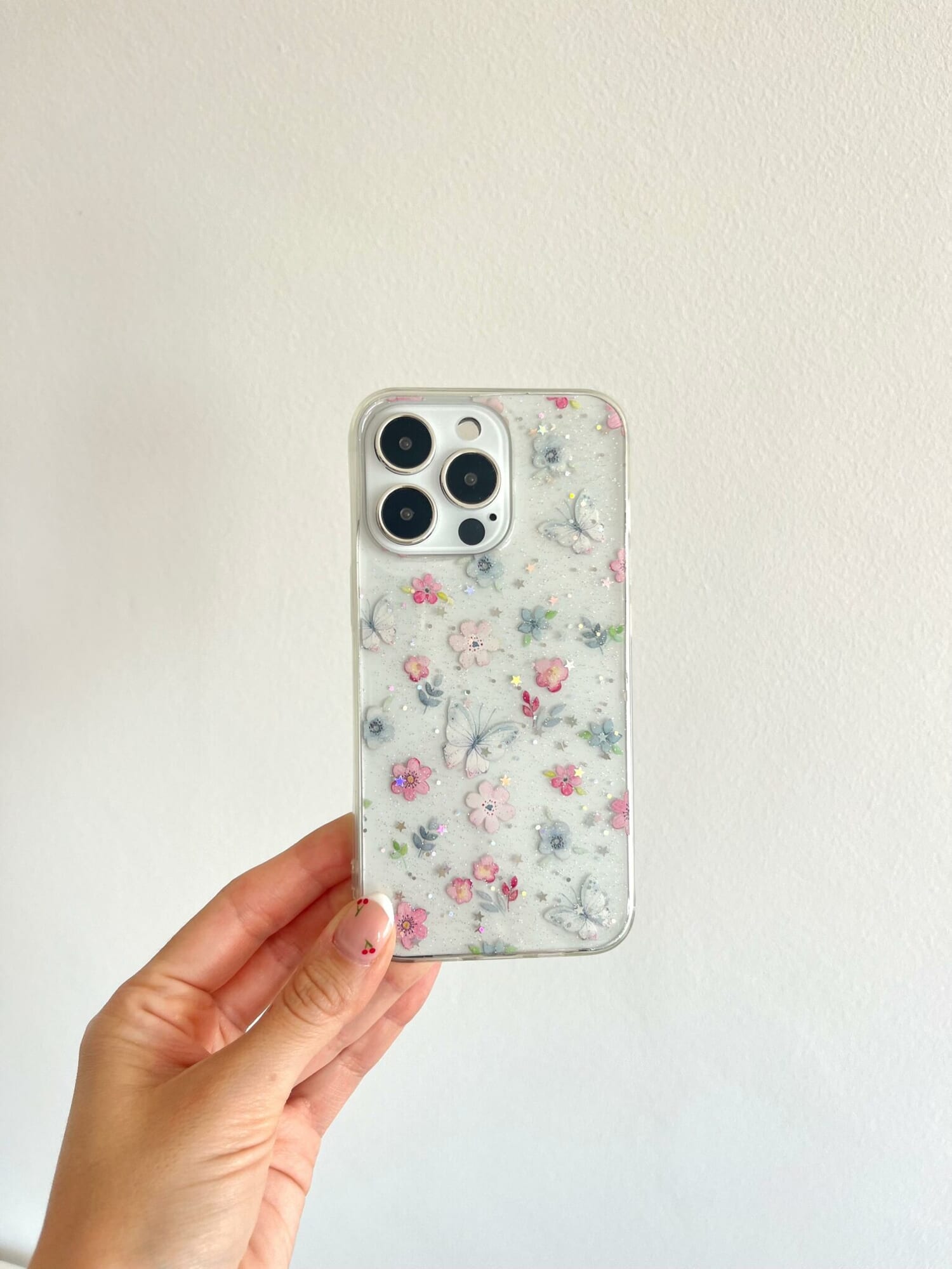 Case de silicona flexible con glitter y estampado de mariposas
