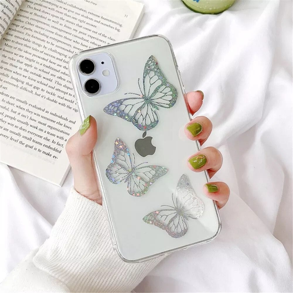Case de silicona semi flexible, con detalles de mariposas plateadas