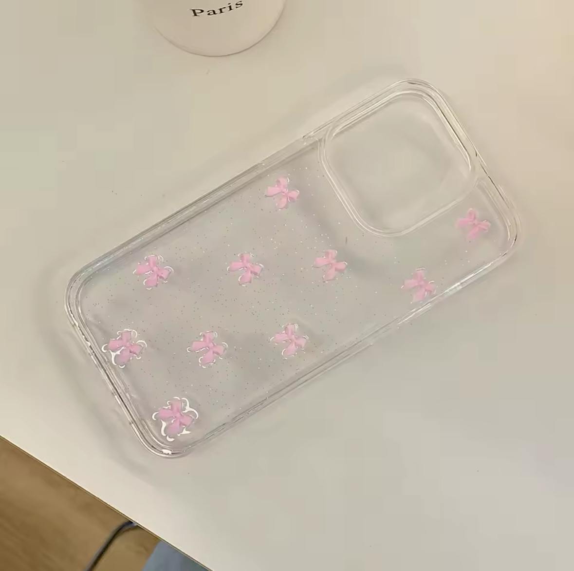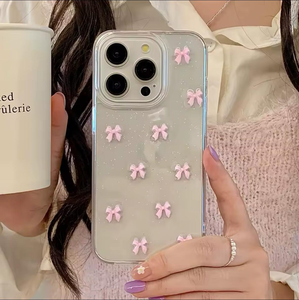 Case rígida con bordes de silicona. Diseño de moñas rosadas con relieve