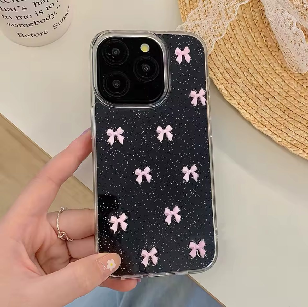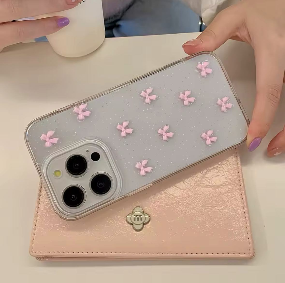 Case rígida con bordes de silicona. Diseño de moñas rosadas con relieve