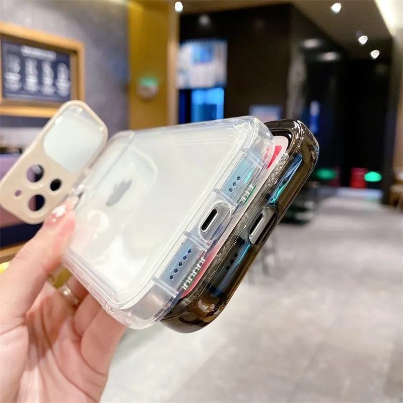 Case transparente semi flexible con tapita blanca, cuenta con protección en las cámaras