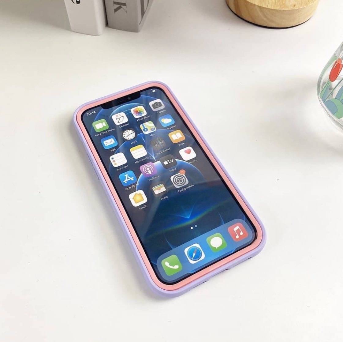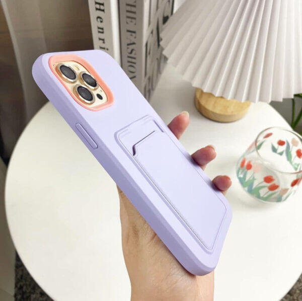 Case lila con detalles en salmón