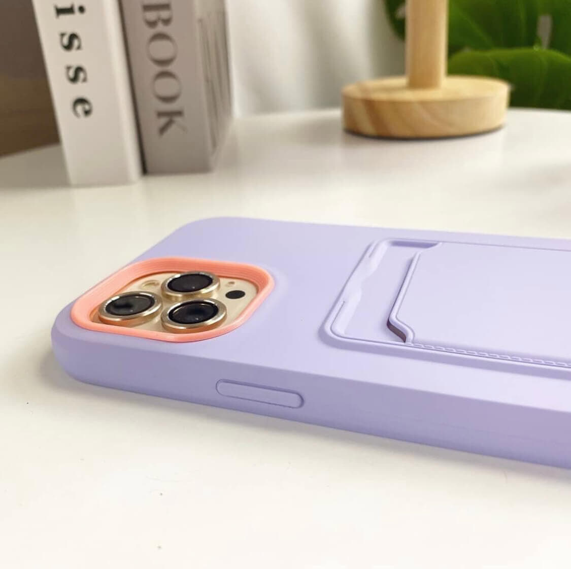 Case lila con detalles en salmón