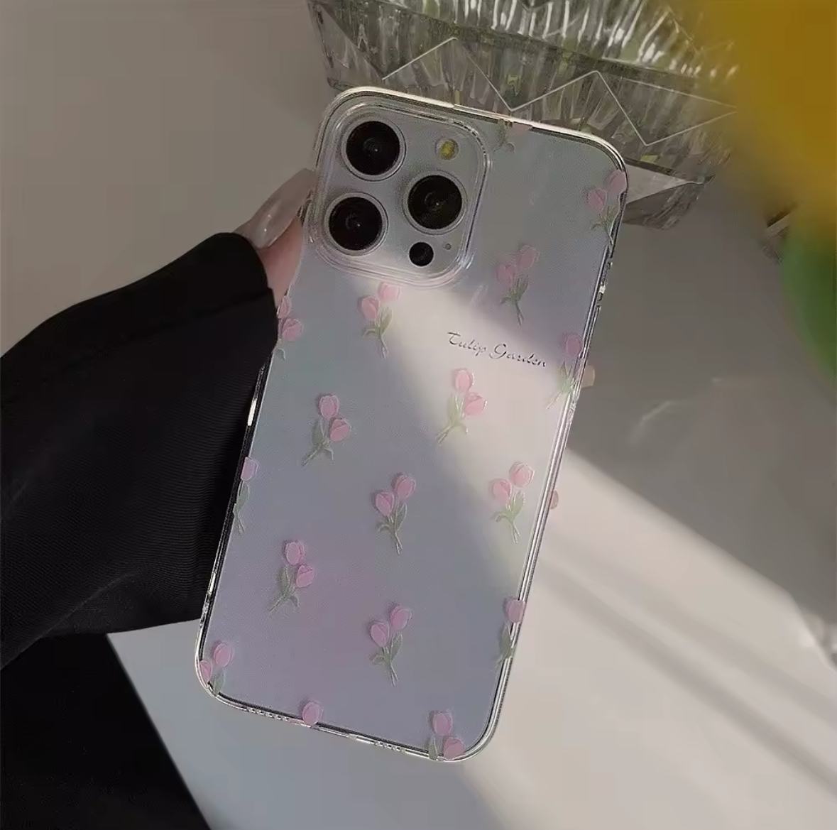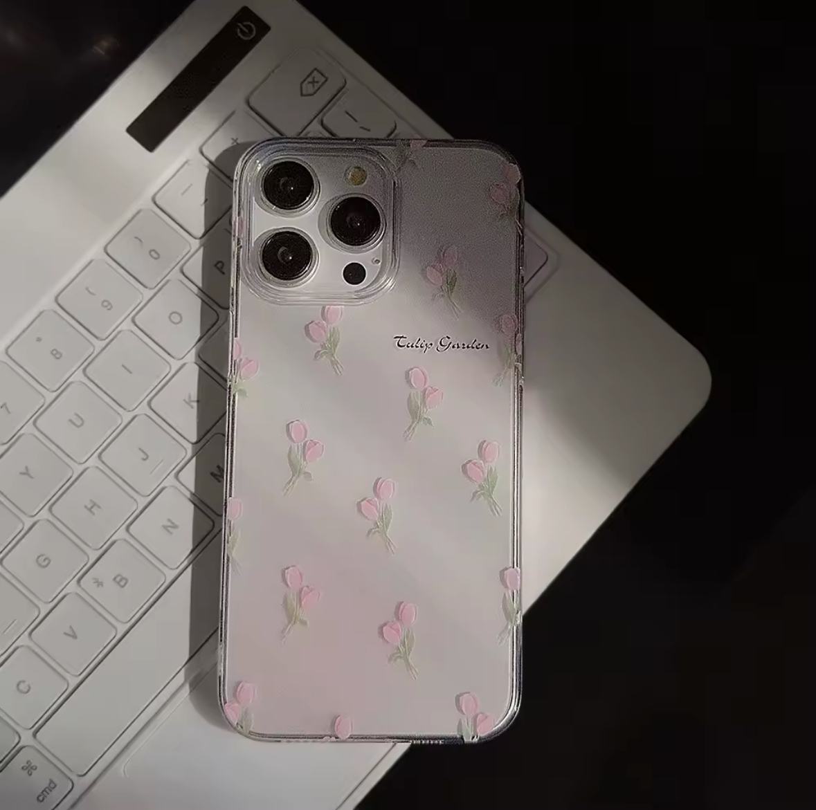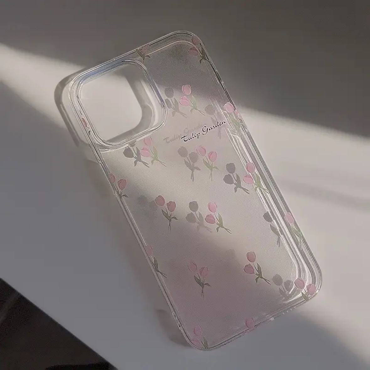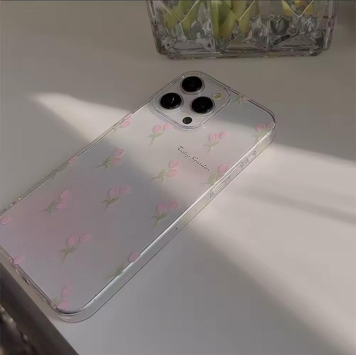 Case transparente de silicona flexible con diseño de tulipanes rosados