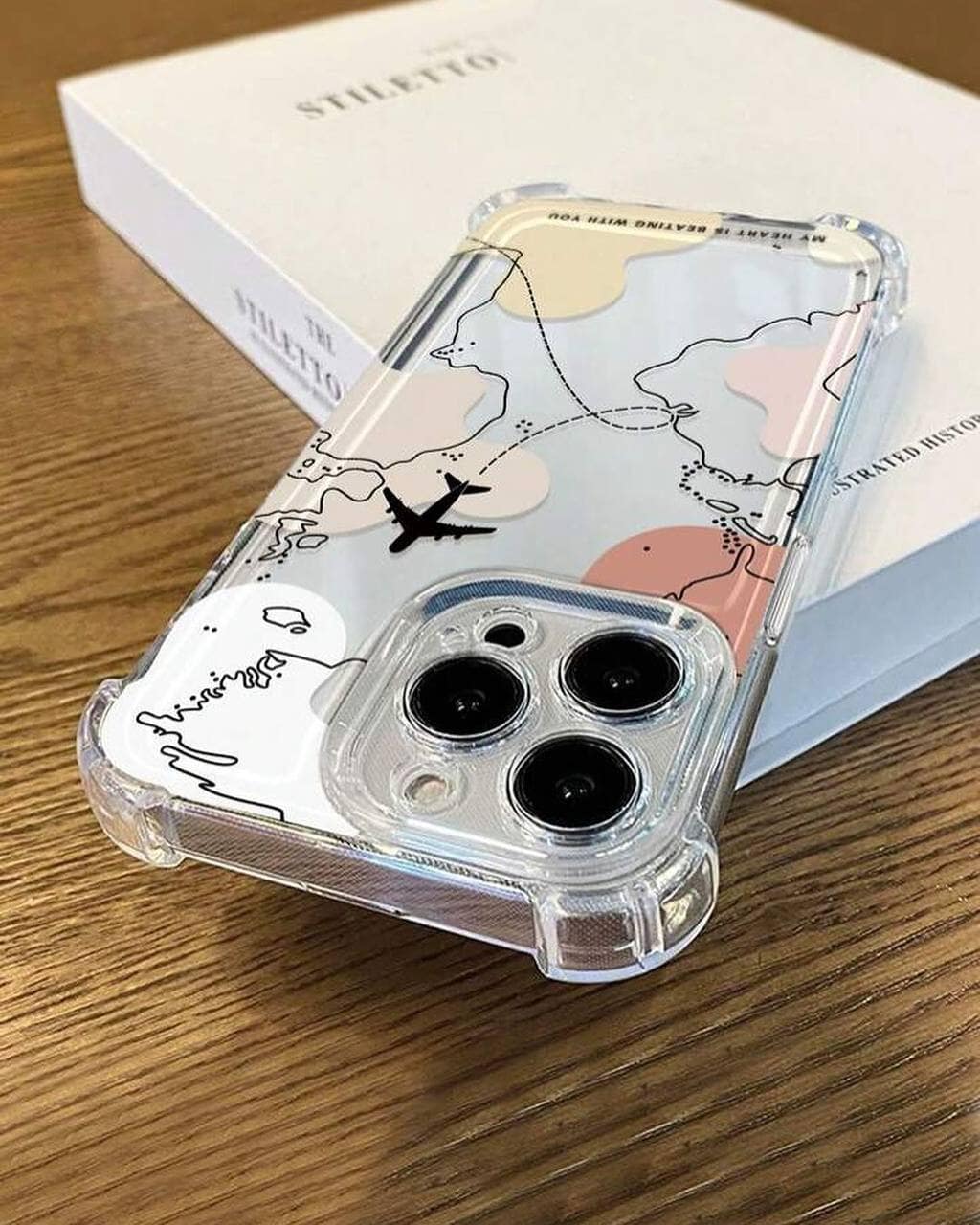Case semi flexible transparente con diseño estampado de viajes. Cuenta con protección entre las cámaras, y con puntas reforzadas.
